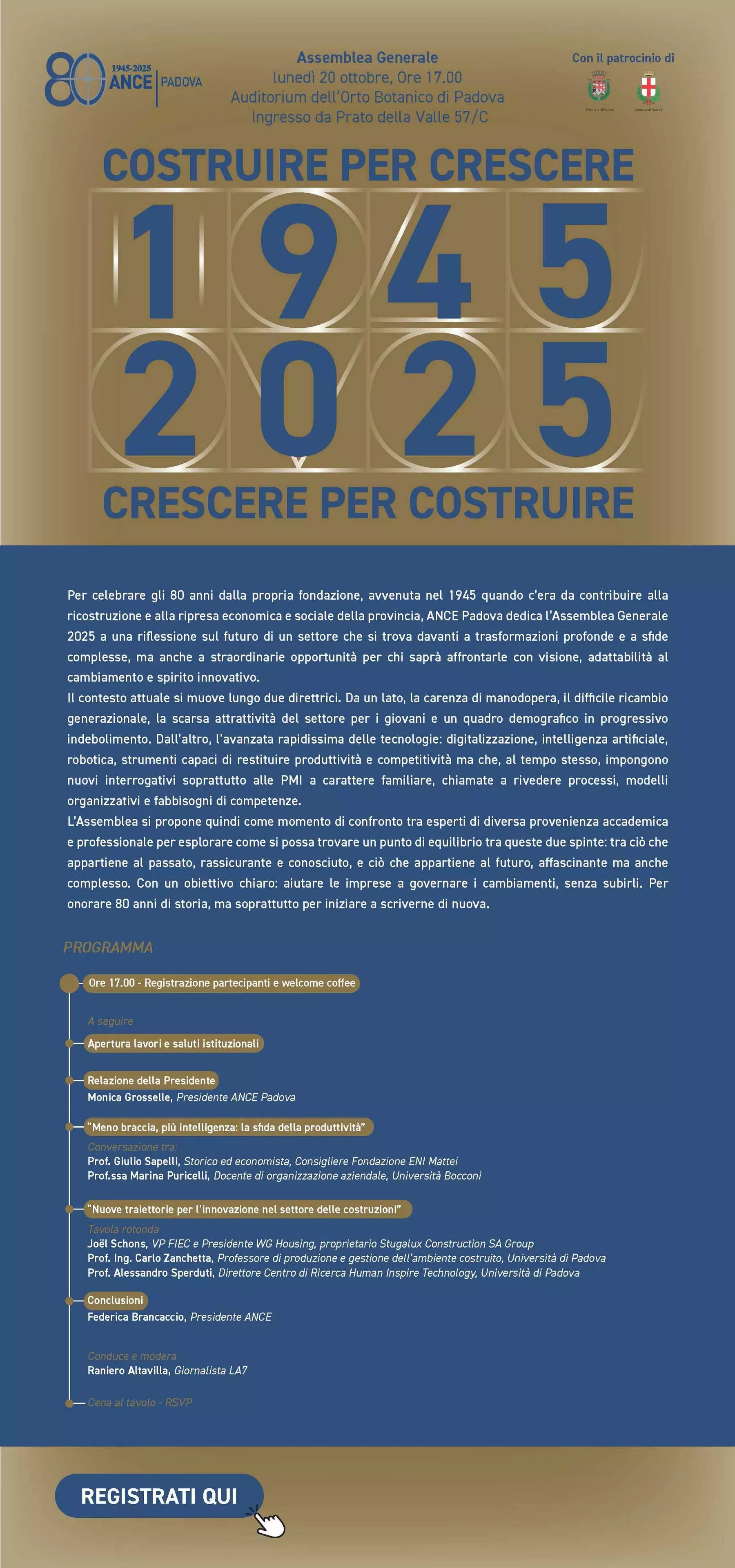 Orgogliosi della storia che ha contribuito a scrivere e che vuole continuare a sostenere ponendosi sempre al servizio della collettività, ANCE Padova ha celebrato questo importante traguardo nel corso dell'Assemblea Generale del 20 ottobre 2025, intitolata "1945. Costruire per crescere - 2025 Crescere per costruire" , con un convegno aperto a tutte le istituzioni sul tema del contributo che digitalizzazione, robotica ed intelligenza artificiale possono offrire al settore in termini di miglioramento di produttività per proiettarsi nel futuro di un comparto chiamato a confrontarsi con trasformazioni profonde e sfide complesse che rappresentano però straordinarie opportunità per chi saprà interpretarle con lungimiranza, adattamento e innovazione. Con un obiettivo chiaro: aiutare le imprese a governare i cambiamenti, senza subirli. Per onorare 80 anni di storia, ma soprattutto per iniziare a scriverne di nuova.